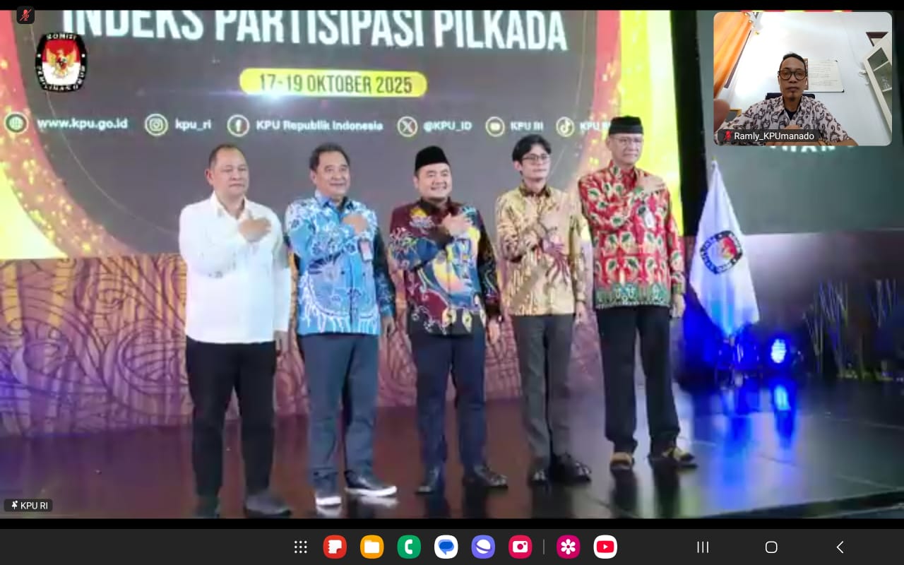 Dalam rangka publikasi pencapaian penyelenggaraan Pilkada Tahun 2024, Komisi Pemilihan Umum Republik Indonesia (KPU RI) menggelar Rapat Koordinasi dan Launching Indeks Partisipasi Pilkada Tahun 2024 secara daring dari Hotel Pullman Jakarta Central Park, Sabtu (18/10). Kegiatan ini diikuti oleh Ketua Divisi Partisipasi Masyarakat dan SDM KPU Kota Manado, Ramly Pateda, bersama jajaran KPU dari berbagai daerah di seluruh Indonesia.