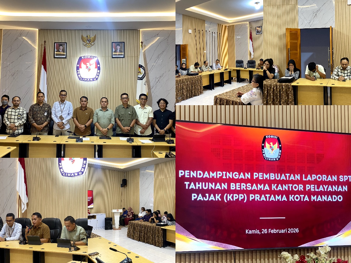 Kamis, 26 Februari 2026, Kantor Pajak Pratama (KPP) Kota Manado melakukan pendampingan pembuatan laporan Surat Pemberitahuan (SPT) Tahunan bersama KPU Kota Manado. Kegiatan ini dilaksanakan sebagai bentuk dukungan terhadap peningkatan kepatuhan administrasi perpajakan di lingkungan KPU Kota Manado.