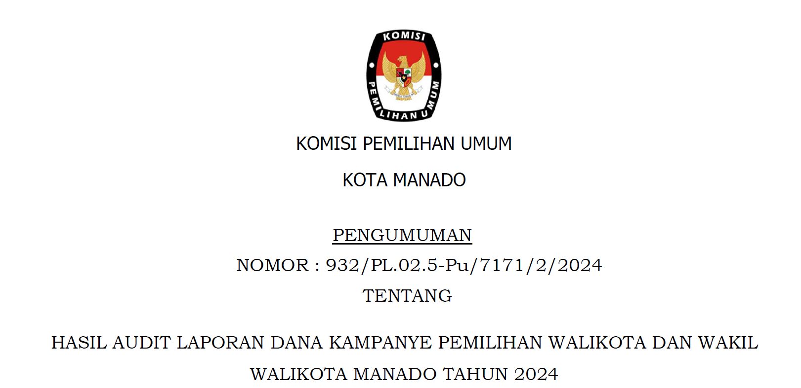 Berdasarkan Tanda Terima dan Berita Acara Penerimaan Hasil Audit Laporan Dana Kampanye Pemilihan Pasangan Calon Walikota dan Wakil Walikota Manado Tahun 2024, disampaikan hasil audit laporan dana kampanye, selengkapnya klik PENGUMUMAN