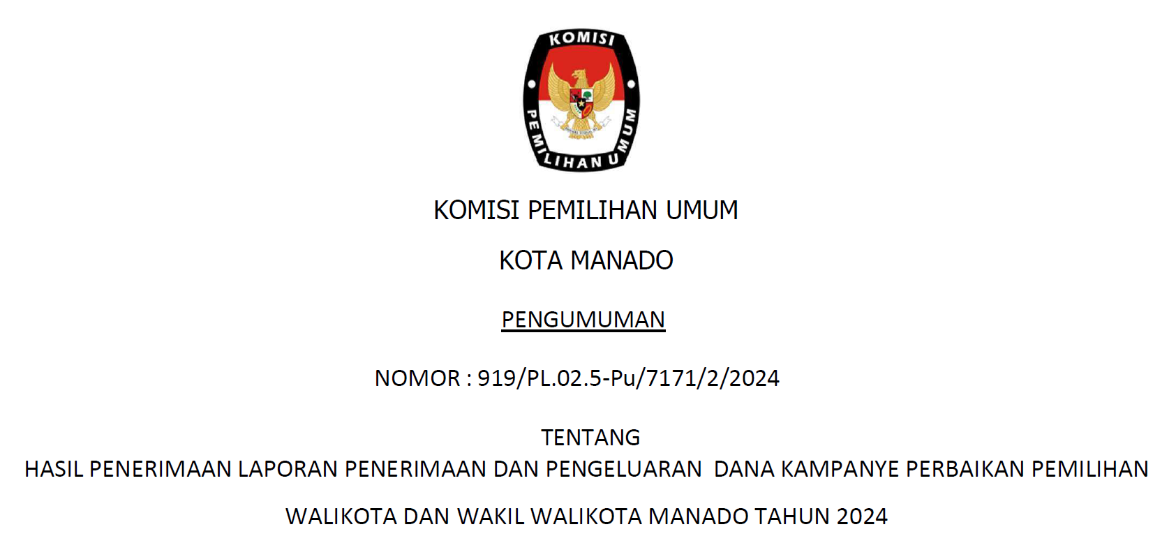 PENGUMUMAN HASIL PENERIMAAN LAPORAN PENERIMAAN DAN PENGELUARAN DANA KAMPANYE PERBAIKAN PEMILIHAN WALIKOTA DAN WAKIL WALIKOTA MANADO TAHUN 2024
