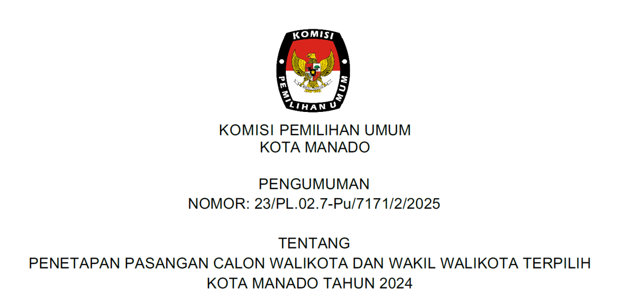 PENGUMUMAN PENETAPAN PASANGAN CALON WALIKOTA DAN WAKIL WALIKOTA TERPILIH KOTA MANADO TAHUN 2024