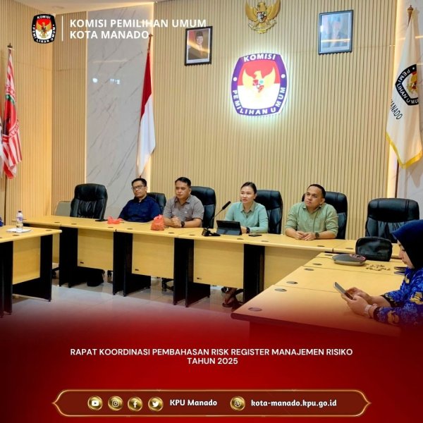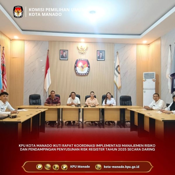 Komisi Pemilihan Umum (KPU) Kota Manado mengikuti kegiatan Rapat Koordinasi Implementasi Manajemen Risiko dan Pendampingan Penyusunan Risk Register Tahun 2025, yang dilaksanakan secara daring pada Kamis, 12 Juni 2025.