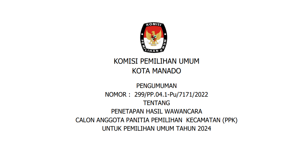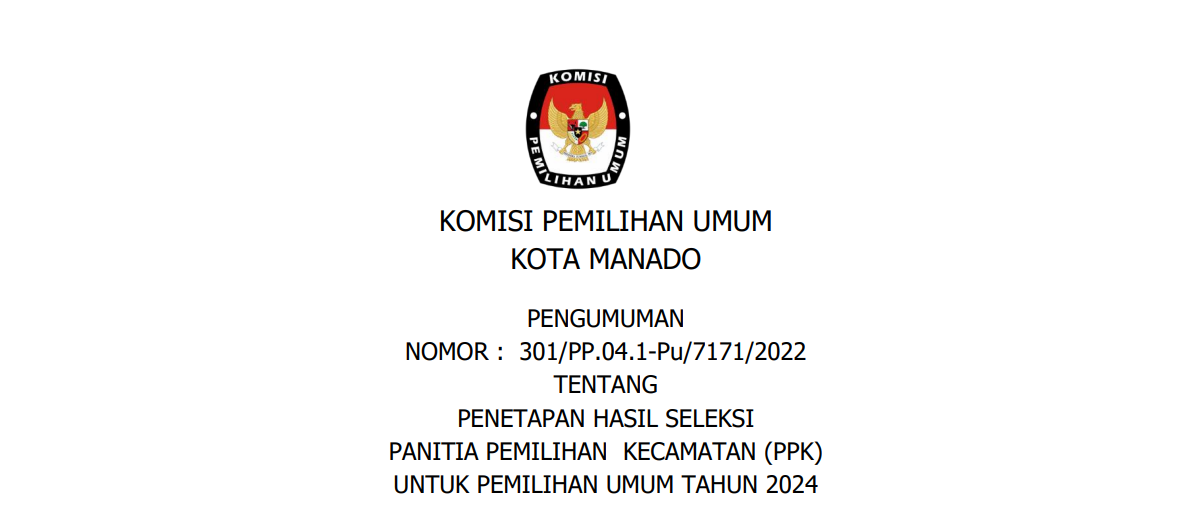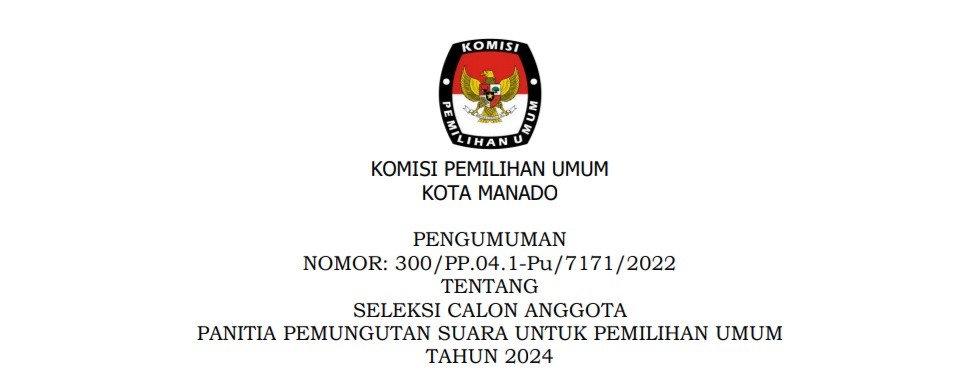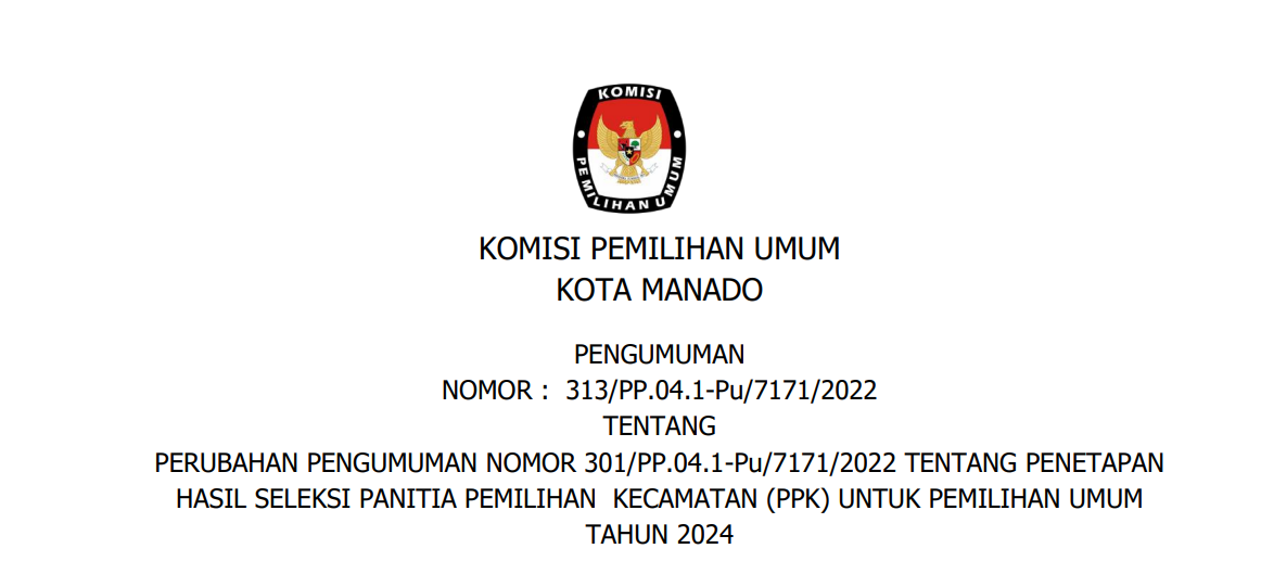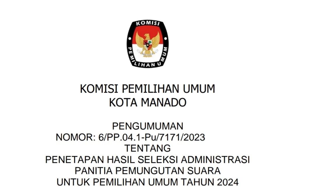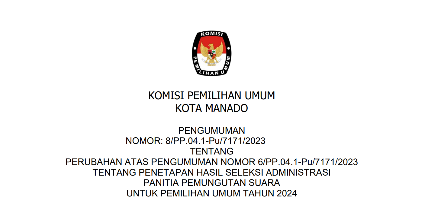 Berdasarkan Berita Acara Rapat Pleno KPU Kota Manado Nomor 4/PP.04.1- BA/7171/2023 tanggal 8 Januari 2023 tentang Rapat Pleno Perubahan Atas Berita Acara Nomor 3/PP.04.1-BA/7171/2023 Tentang Penetapan Hasil Seleksi Administrasi Panitia Pemungutan Suara untuk Pemilu Tahun 2024 dan Surat Dinas KPU RI Nomor 16/PP.04-SD/04/2023 disampaikan hal-hal sebagai berikut: