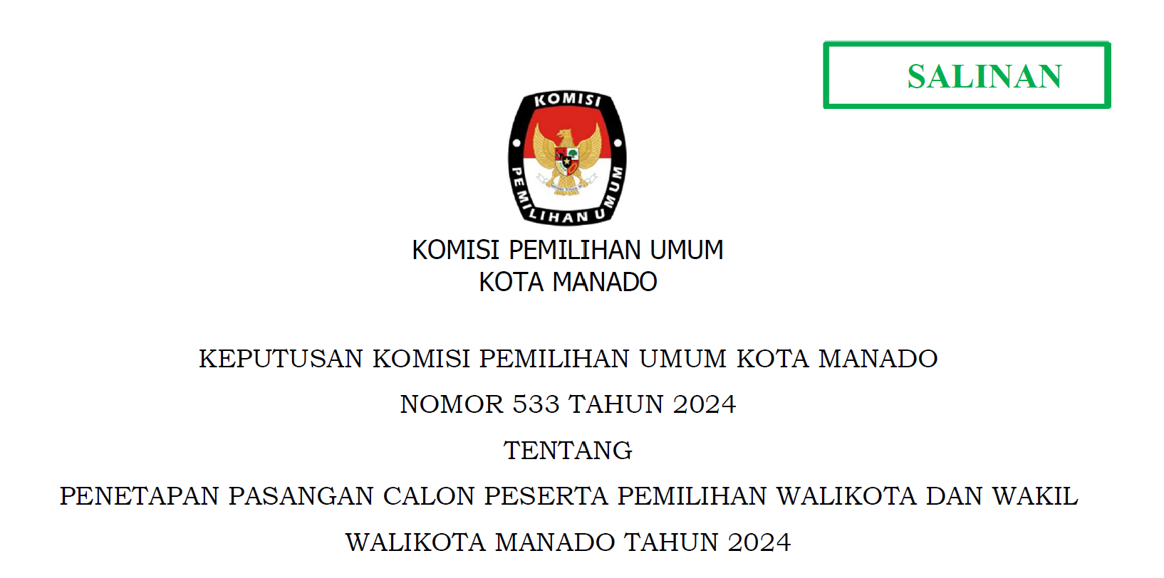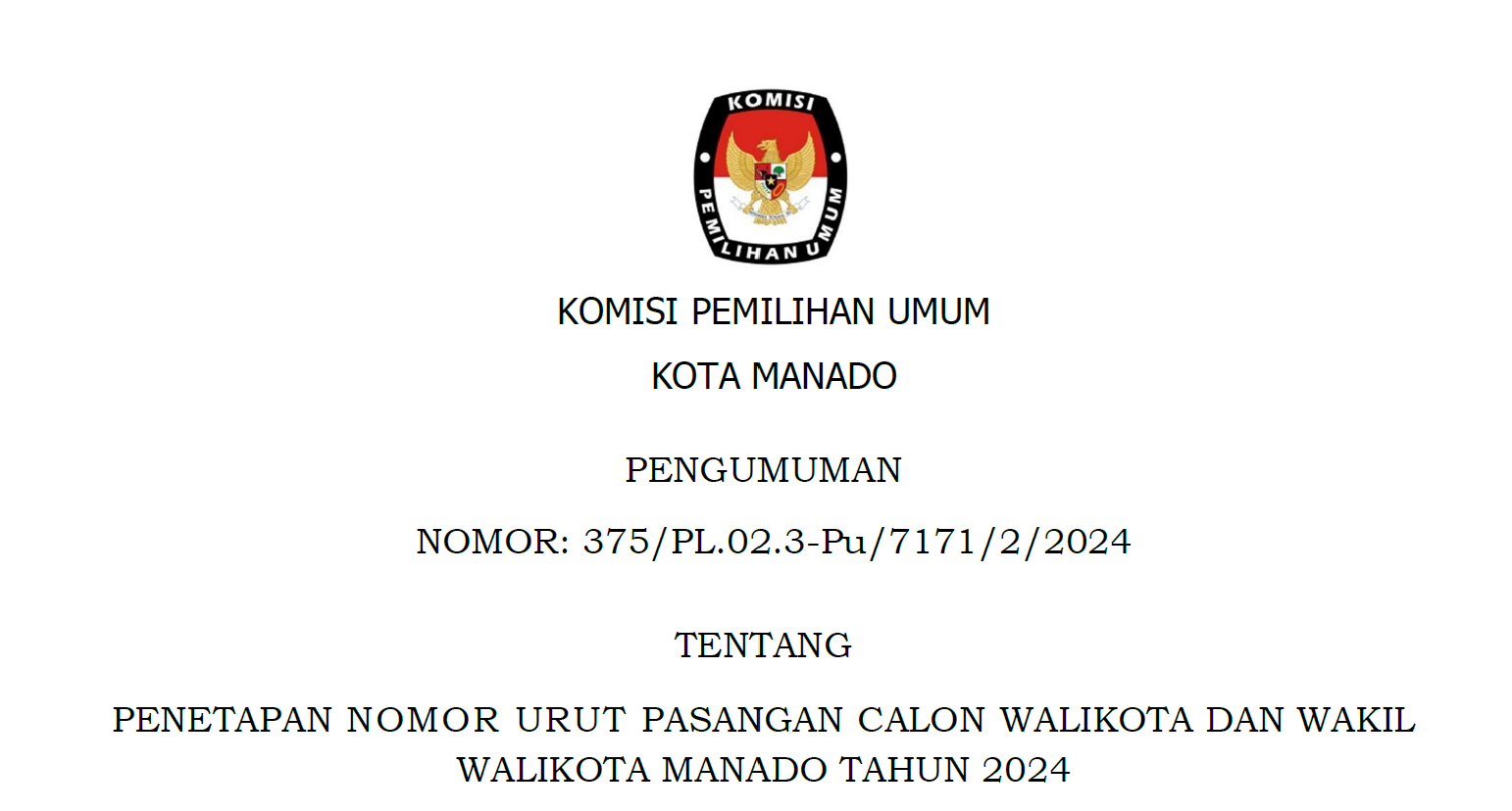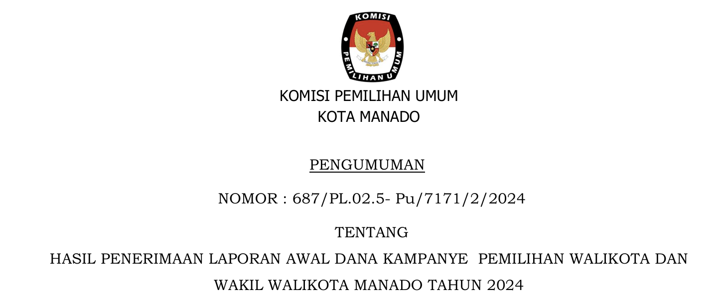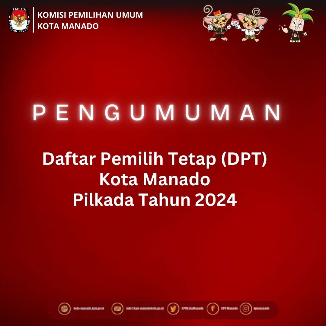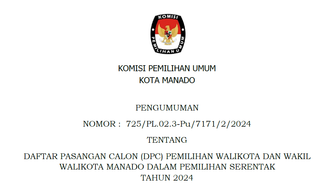 Berdasarkan Pasal 123 Ayat (1) Peraturan Komisi Pemilihan Umum Nomor 8 Tahun 2024 tentang Pencalonan Gubernur dan Wakil Gubernur, Bupati dan Wakil Bupati, serta Walikota dan Wakil Walikota, sebagaimana dirubah dengan Peraturan Komisi Pemilihan Umum Nomor 10 Tahun 2024, dengan memperhatikan Keputusan Komisi Pemilihan Umum Kota Manado 534 Tahun 2024 tentang Penetapan Nomor Urut Pasangan Calon Peserta Pemilihan Walikota dan Wakil Walikota Manado Tahun 2024, yang ditetapkan tanggal 23 September 2024. Berikut diumumkan Daftar Pasangan Calon (DPC) Pemilihan Walikota dan Wakil Walikota Manado dalam Pemilihan Serentak Tahun 2024. Selengkapnya klik PENGUMUMAN