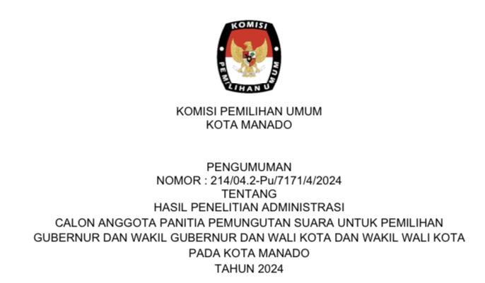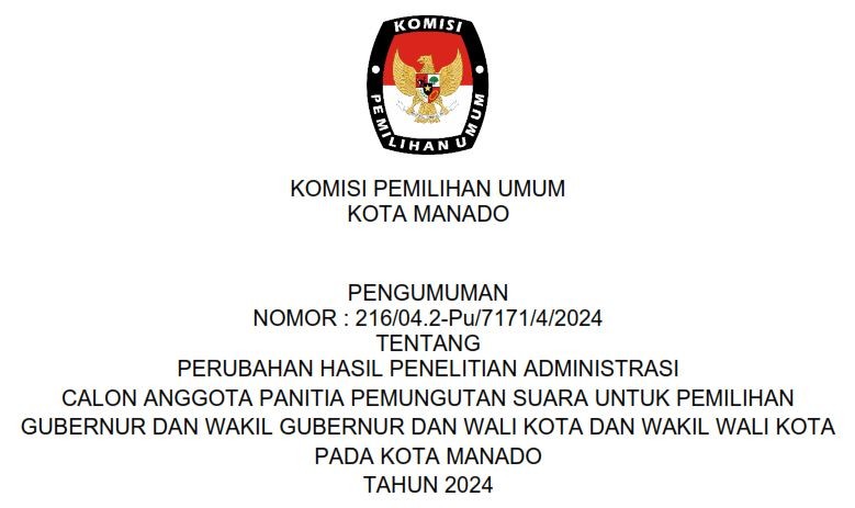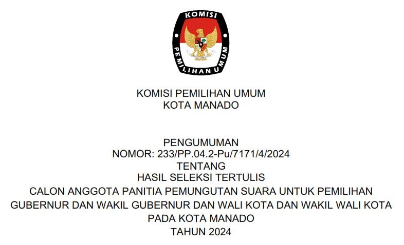 Sehubungan dengan Komisi Pemilihan Umum Kota Manado telah melaksanakan tahapan Wawancara dan menyelesaikan seluruh tahapan seleksi Calon Anggota Panitia Pemilihan Kecamatan untuk Pemilihan Gubernur dan Wakil Gubernur, dan Wali Kota dan Wakil Wali Kota Tahun 2024, disampaikan beberapa hal sebagai berikut: