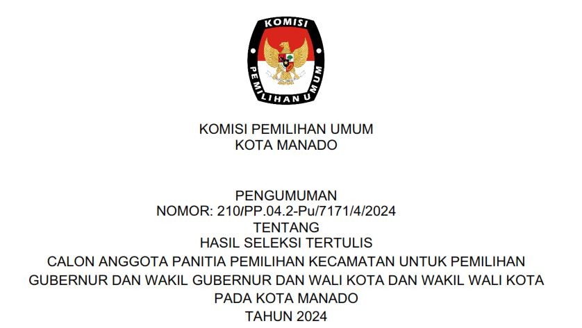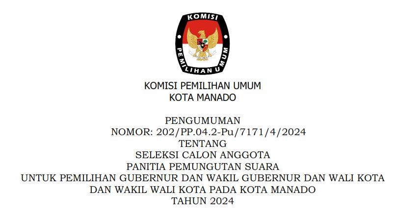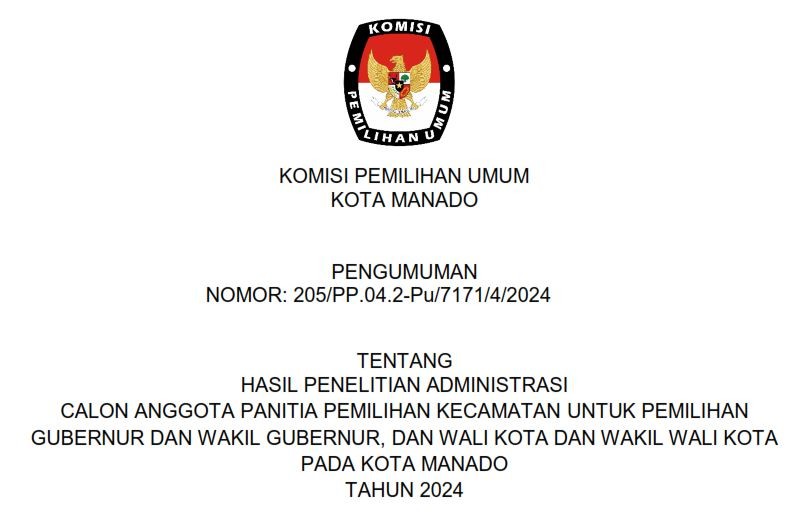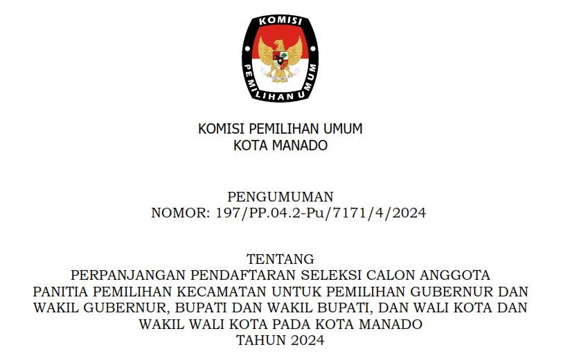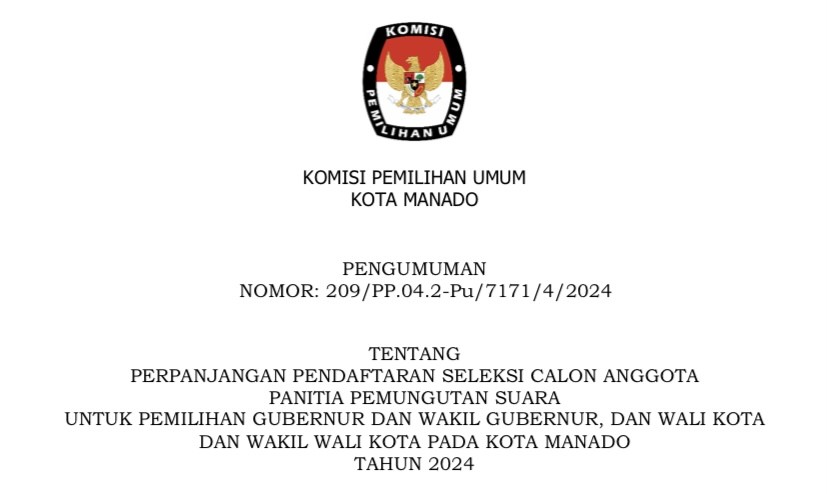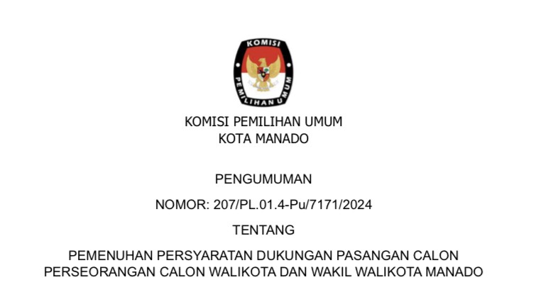 Berdasarkan Ketentuan Pasal 41 ayat (1) Undang-undang (UU) Nomor 10 Tahun 2016 tentang Perubahan Kedua Atas Undang-Undang Nomor 1 Tahun 2015 Tentang Penetapan Peraturan Pemerintah Pengganti Undang-Undang Nomor 1 Tahun 2014 Tentang Pemilihan Gubernur, Bupati, dan Walikota Menjadi Undang-Undang serta Peraturan Komisi Pemilihan Umum Nomor 2 Tahun 2024 tentang Tahapan dan Jadwal Pemilihan Gubernur dan Wakil Gubernur, Bupati dan Wakil Bupati, serta Walikota dan Wakil Walikota Tahun 2024, maka Komisi Pemilihan Umum Kota Manado mengumumkan Pemenuhan Persyaratan Dukungan Pasangan Calon Perseorangan Calon Walikota dan Wakil Walikota Manado Tahun 2024, untuk selengkapnya klik PENGUMUMAN