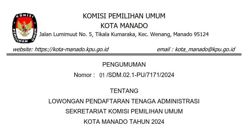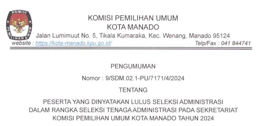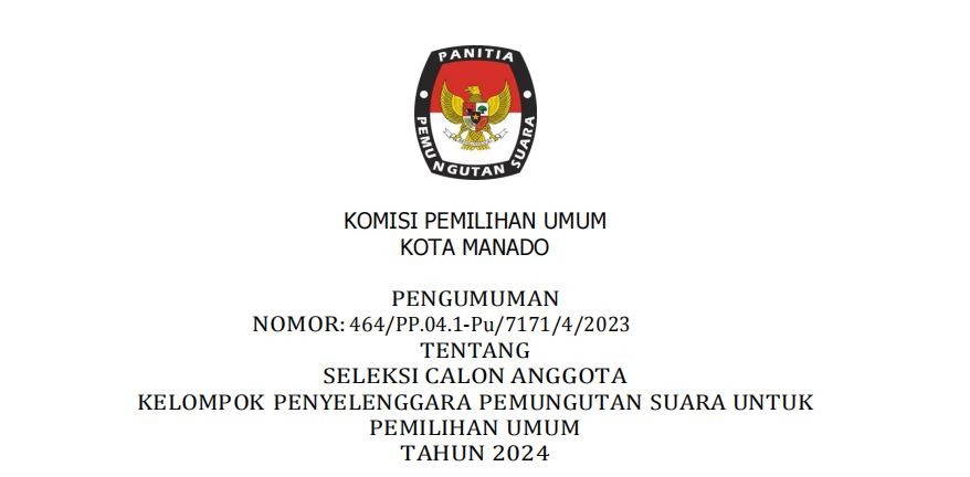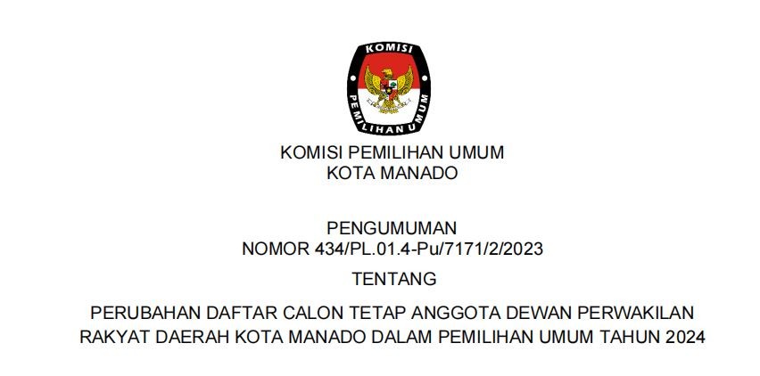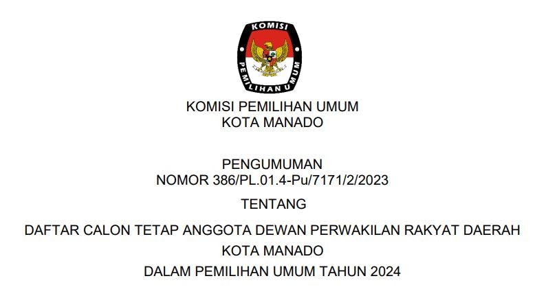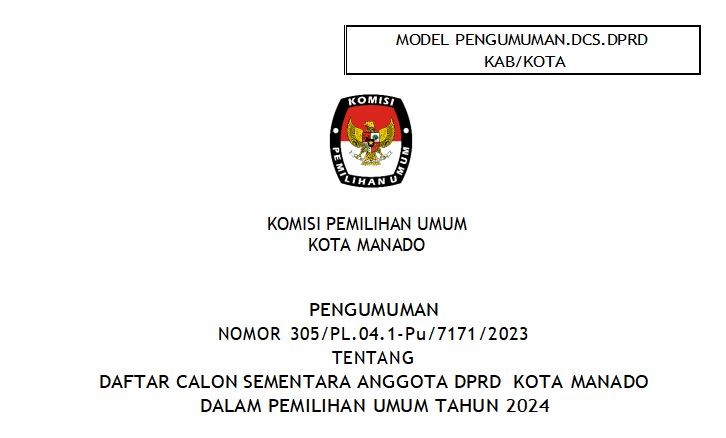Bahwa untuk melaksanakan ketentuan Pasal 70 Peraturan KPU Nomor 10 Tahun 2023 tentang Pencalonan Anggota Dewan Perwakilan Rakyat, Dewan Perwakilan Rakyat Daerah Provinsi, dan Dewan Perwakilan Rakyat Daerah Kabupaten/Kota, KPU KOTA MANADO mengumumkan Daftar Calon Sementara (DCS) Anggota DPRD KOTA MANADO dan persentase keterwakilan perempuan dalam Daftar Calon Sementara (DCS) sebagaimana terlampir.