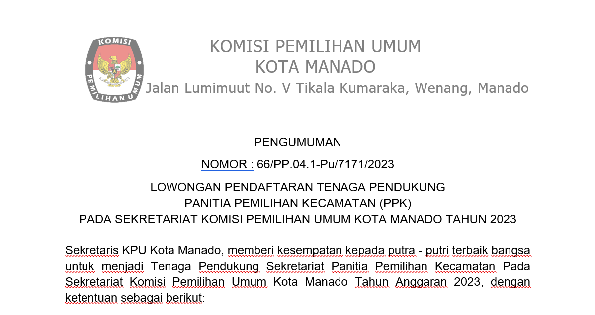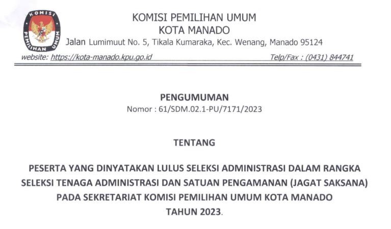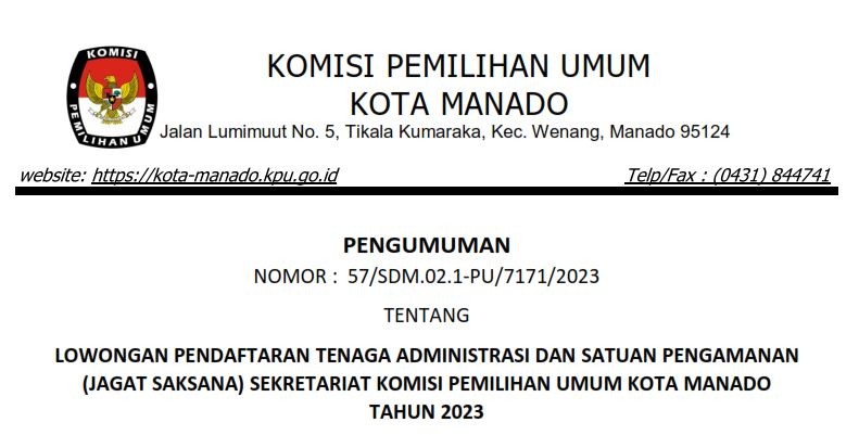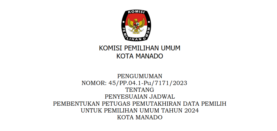 Berdasarkan Keputusan KPU RI Nomor 67 Tahun 2023 Tentang Perubahan Kedua Atas Keputusan KPU RI Nomor 476 Tahun 2022 Tentang Pedoman Teknis Pembentukan Badan Ad Hoc Penyelenggara Pemilihan Umum Dan Pemilihan Gubernur Dan Wakil Gubernur, Bupati Dan Wakil Bupati, Dan Walikota Dan Wakil Walikota, serta memerhatikan Surat Dinas Ketua Komisi Pemilihan Umum Republik Indonesia Nomor 145/PP.04-SD/04/2023 tertanggal 4 Februari 2023, Perihal Penyesuaian Jadwal Pembentukan dan Masa Kerja Pantarlih untuk Pemilu 2024, maka KPU Kota Manado menyampaikan pengumuman yang dapat diunduh disini.